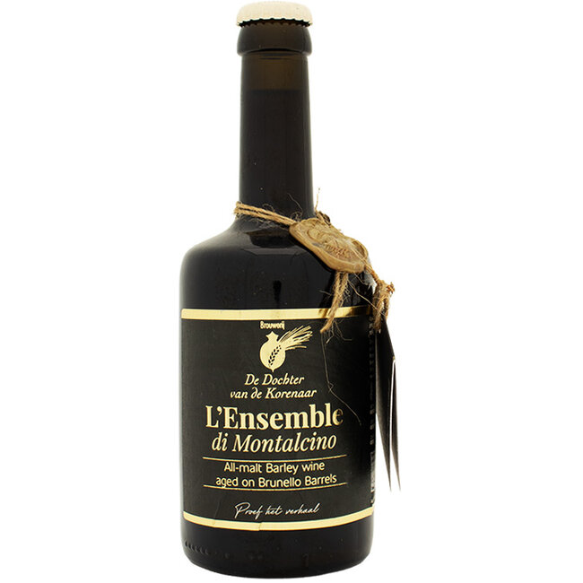 De Dochter van de Korenaar L'ensemble di Montalcino in kleine fles is een Vintage vatgelagerde Barleywine van 13%. Deze volmout Barleywine rijpte voor meer dan een jaar op Brunello di Montalcino wijnvaten.