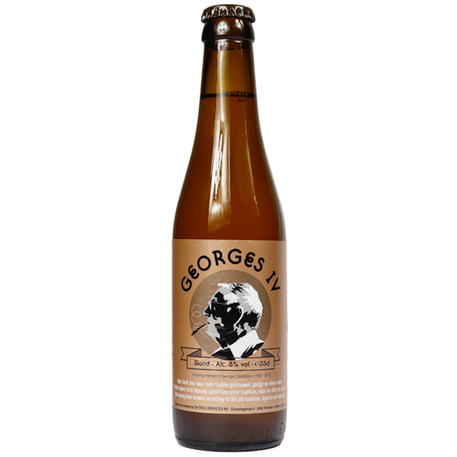 De basis van Georges IV is een blond bier, dat maar liefst bijna twee jaar rijpte op eikenhouten vaten die eerder whisky bevatten. Deze langdurige vatrijping geeft het bier een uniek en verfijnd karakter. In geur en smaak proef je duidelijke tonen van eikenhout, whisky en vanille, prachtig verweven met de zachte, moutige basis van het blonde bier. De houtinvloed is uitgesproken maar elegant, met een warme, ronde afdronk die lang blijft hangen.